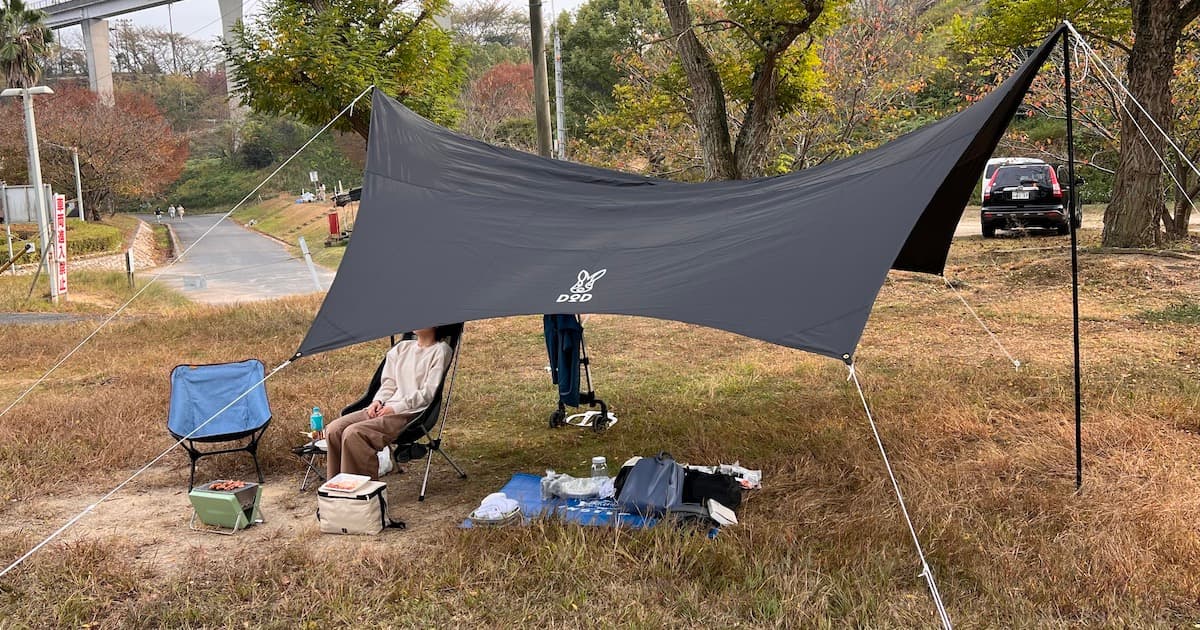 はじめてのタープ設営は思ってるより手こずるよって話、と初心者用デイキャンプ用品紹介🔨 多々羅キャンプ場/いつかのタープ/DOD/グリルアタッシュS/LOGOS